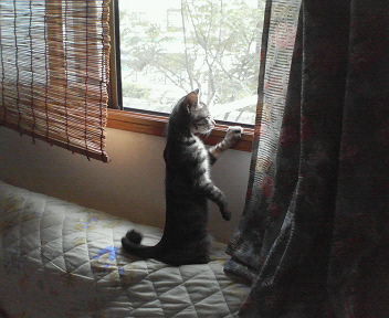 「ミーアキャット?」みたいなシャンとした姿勢で外を観察するシマダさん。猫だから猫背のはずなのに背中はシャキッとまっすぐです。 本日私は、山手線某駅をおりた所の駅前広場で人と待ち合わせの約束をしていました。時間より早く場所についたら突然の俄雨。約束相手に待ち合わせ場所を近くの書店に変更して欲しいとメールを打ち、書店に向かいました。私は本が大好きなので新刊コーナーであれこれと書籍を物色していましたら肩を叩かれました。私は待ち合わせ相手かと思いスマイルなカンジで振り向いたら、全然知らない中年男性で「シュンヤ君だよね?写真より大人っぽいね?」と言われ私は何が何だかわからず「ちっ違いますが・・・お人違いでは」と言ったら、横から安物香水の匂いが立ち込め ふと匂いの先を見ると、私くらいの身長、ロン毛、メガネな不健康そうなゆるいホストみたいな若者がいました。中年男性は私に「あっ間違えたようです、スイマセン」と言い、その若者の方へ歩いて行き、何やら話をしていました。するといきなり私と背格好の 似た若者は私の事を上から下までジロジロと見て、挙げ句に私に不躾な一瞥をくれて中年男性と書店を出ていきました。私はなんか不愉快な気持ちになりましたが、デブチビハゲの中年男性は恐らく私と同年代と見受けられ、同世代の人あ間から若者扱いされたのがプチ満更でもないなと思い、その直後に書店に現れた私の友人にその事を言うと「それはなにか怪しい商売の人と間違えられたに違いない、若く見られて嬉しいなどと思うのは大間違い、むしろ年相応の格好、生き方をしていたらそんな変な人違いはされない」と説教されたのでした。一言も言い返せない私でした。