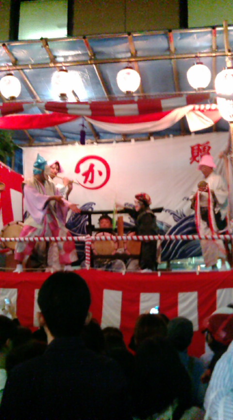日曜日の夜に川越の夜祭りに行きました。昨年チラリと見て興味を覚えて今年は本格的に祭りで賑わう町に繰り出しました。趣向を凝らした山車、お囃子、狐、ひよっとこ、オカメの面をつけて乱舞する踊り手。江戸の風情を残す町並み・・・。山車の後をついて人ごみに身をまかせて歩いていると、一際にぎわい、歓声をあげている場所がありました。遠目で見ると、ひよっとこの面をつけたすごく小さい人が、面白おかしく舞扇を操り踊っていました。「大人だけど小さい人?」あるいは「猿?」と思ったのですが、近寄って見るとなんと幼児が芯の舞手をつとめ、かつデタラメに踊っているのではなく、腰の座ったきちんとした振り付けでお囃子の調子に合わせて踊っているのです。見物客はやんや、やんやの喝采を幼児に送っています。するとお菓子を舞台に差し入れる人がいて、それを受け取った幼児は、きちんとひよっとこの演技をしながらお菓子をいただき、その喜びをリズムをとりながら表現するのです。次にティッシュに包まれたおひねりが舞台に投げ込まれたのですが、ひよっ とこ幼児はそのティッシュをつまむとしげしげと見て、なんとポイッと投げ捨てたのです。幼児にとってはお菓子は嬉しいけどティッシュはゴミにしか見えなかったようですが、それがまた観客の爆笑をかい、ひよっとこ幼児はおどけた動作で頭をポリポリと掻いてみせるというアドリブを見せ、さらに観客は盛り上がるのでした。万雷の拍手を貰った幼児の踊りはトランスに近い状態になりますます、踊りに熱をおびていきましたが、自分の高揚に戸惑った幼児は混乱したようすで仮面の下からわんわんと泣いている声が聞こえましたが、ひよっとことしての踊りは継続し観客を魅了しました。囃子手の口上によると四歳にて神楽デビューとの事。モミジみたいな手で大人仕様の舞扇を手にピンの役割を見事につとめた四歳ひよっとこに、私は完全にキマってしまい、路上でピョンピョンと跳ねながら「ヒューヒュー」と幼児に向かい声援を送ってしまいました。幼児なのに舞台に酔いしれているちびっ子踊り手、きっと大人になっても、祭りにの時には、お面をつけて、一年に一度のお祭りで踊 っちゃうんだろうなと思いました。スーパーキッズひよっとこの神楽、よいものを見た一時でした。